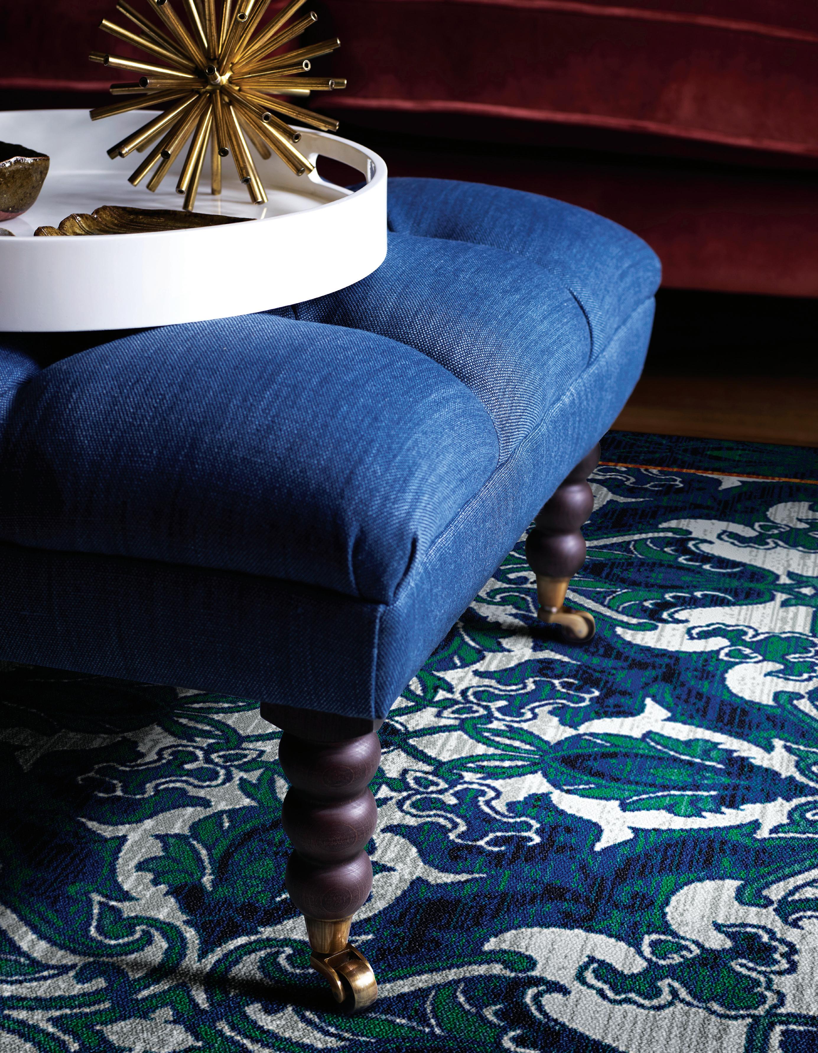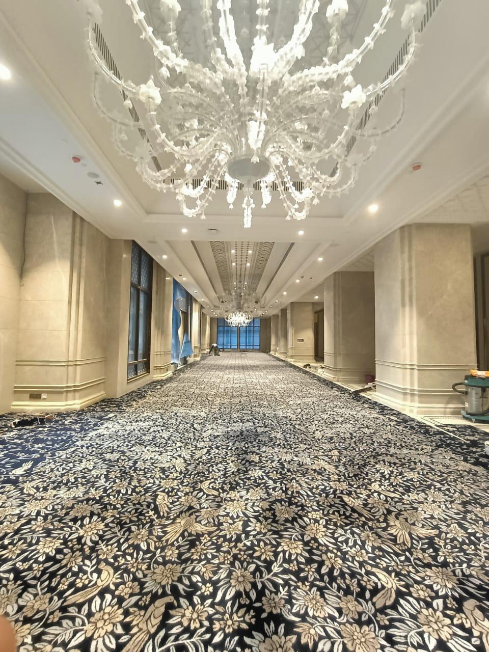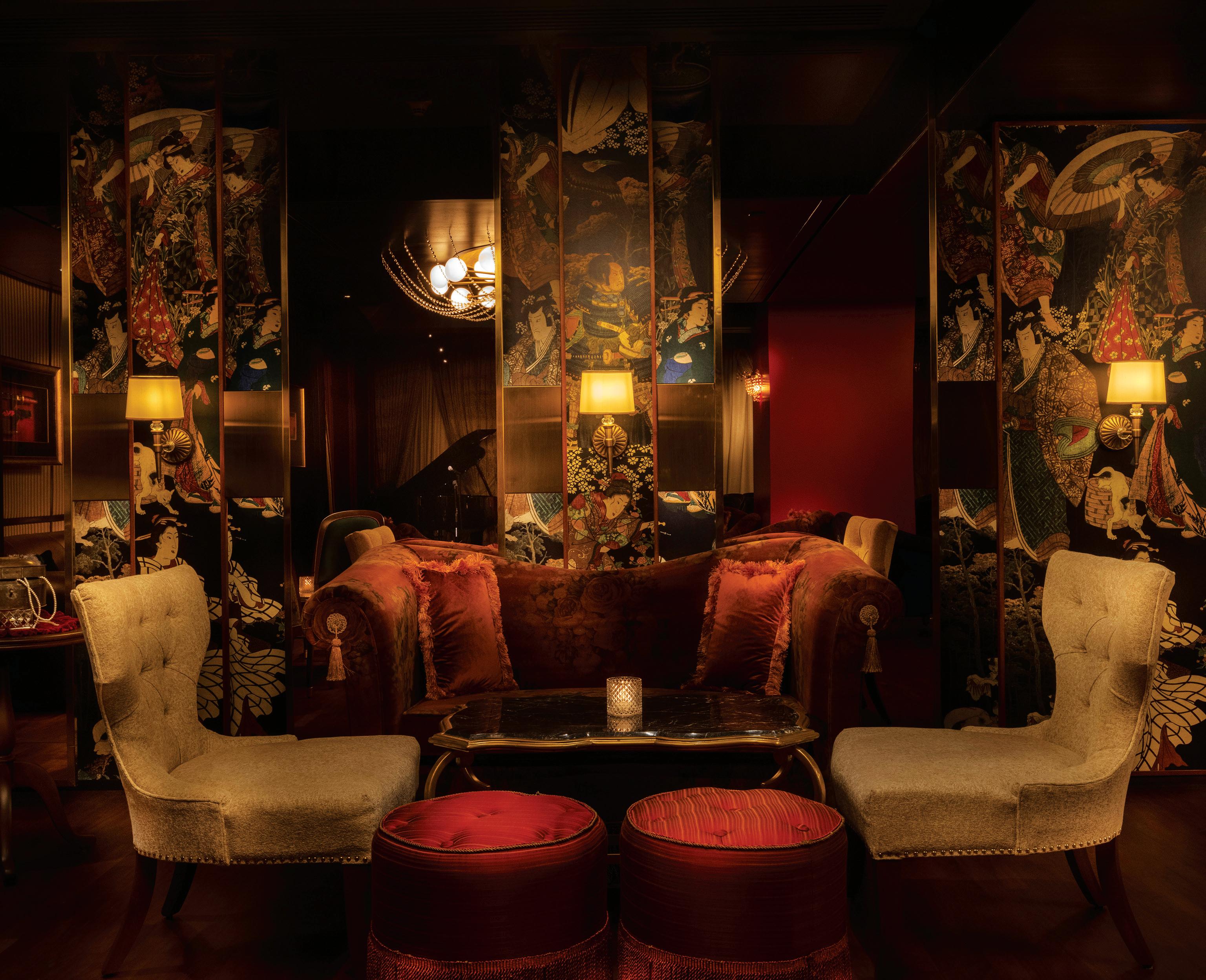 The soft, dim glow of chandeliers gently reveals a world of plush sofas, rich Japanese imagery, gleaming mirrored surfaces, and sumptuously embroidered textiles imprinted with traditional Indian artisanal forms (from Sabyasachi for Nilaya by Asian Paints’ Heartland Collection) that refer to Kyoto’s preoccupation with the perfection of handmade art and craft.