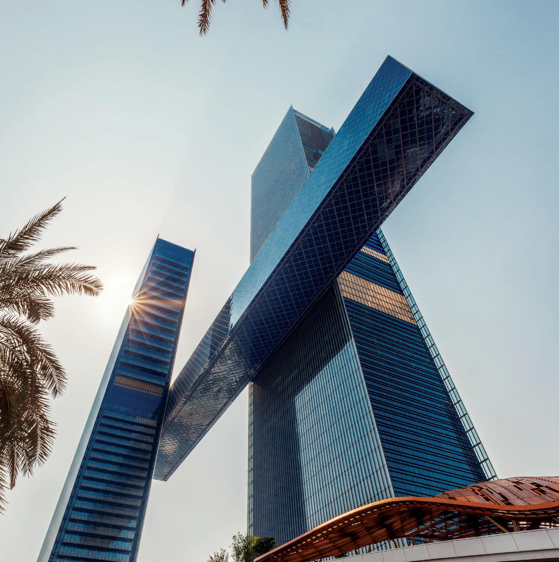 Designed by Japanese architect Nikken Sekkei, the hotel features two asymmetrical towers connected by The Link, a cantilevered podium housing Dubai’s longest infinity pool, celebrity-chef restaurants, and more. The towers' minimalist, sharp design eliminates peripheral
