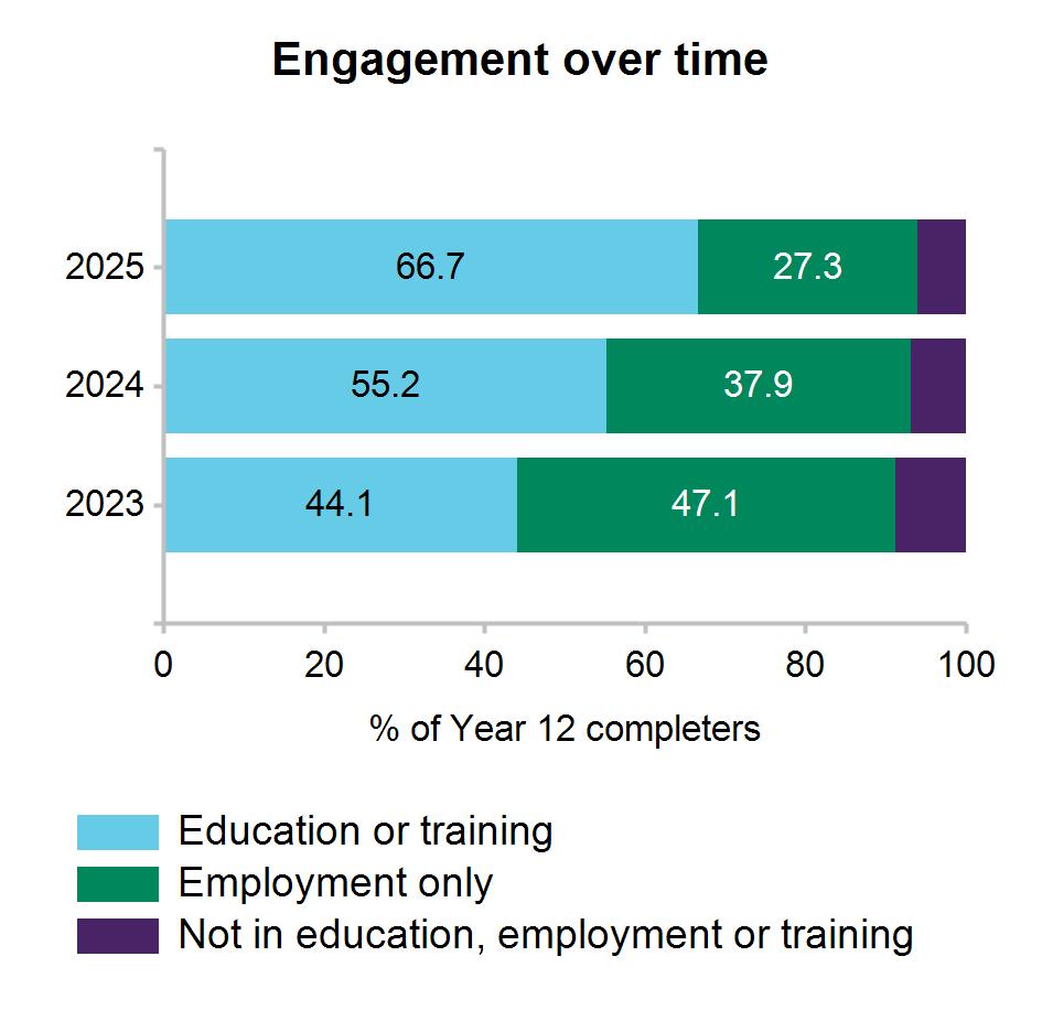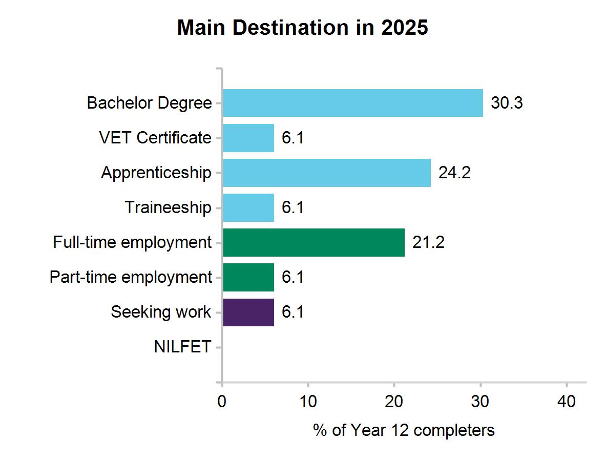 All Year 12 completers were assigned to a main destination. Respondents who were both studying and working are reported as being in education or training, including apprentices and trainees.