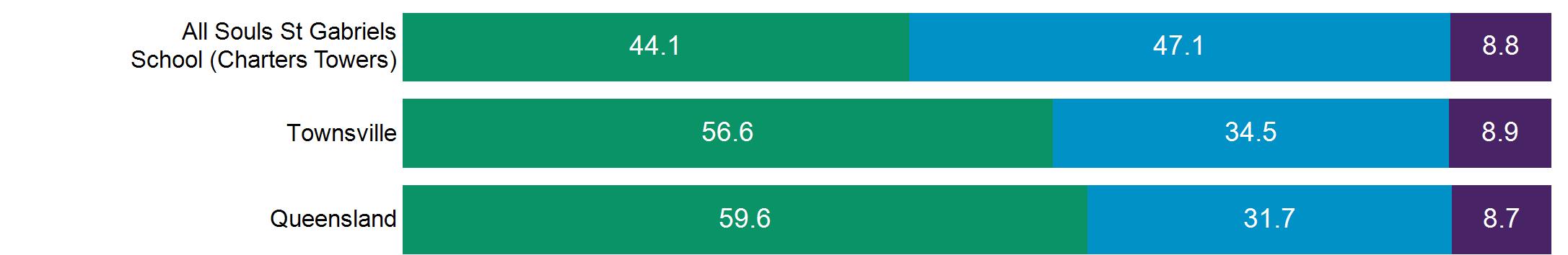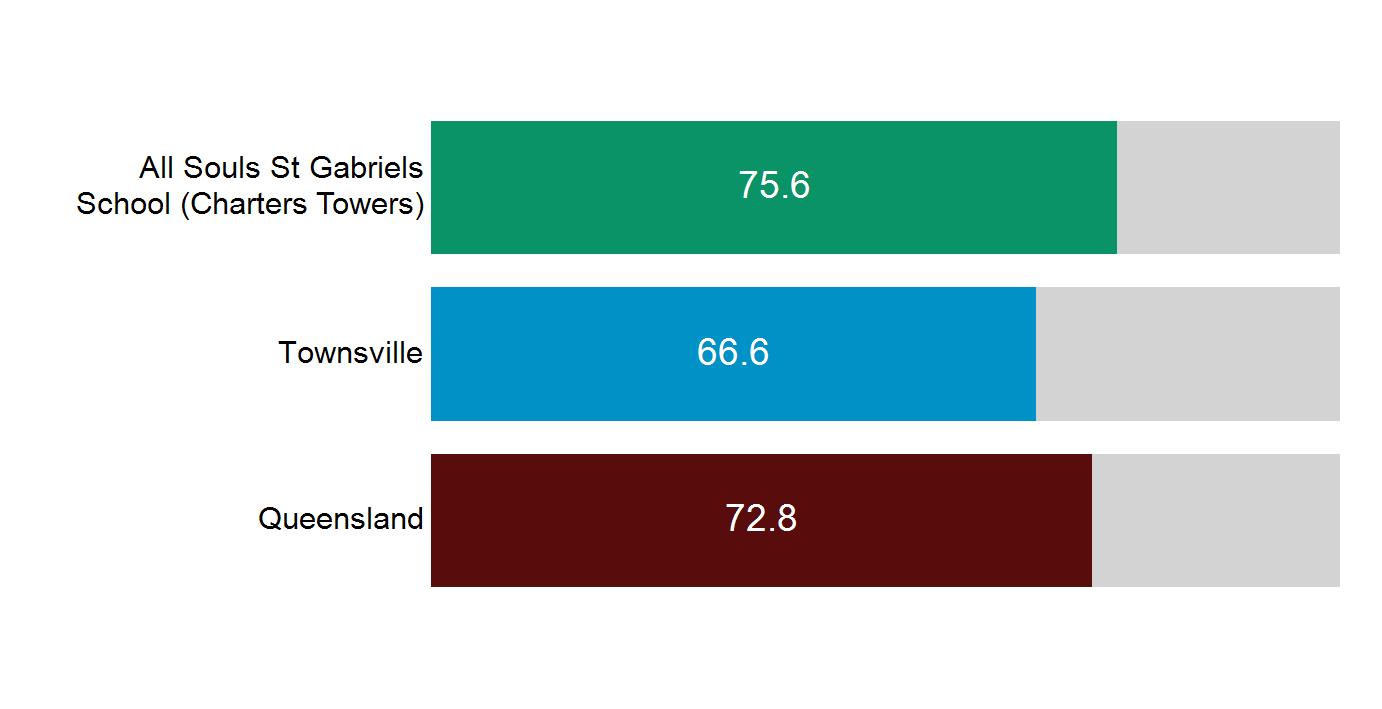 Year 12 completers fromAll Souls St Gabriels School (Charters Towers)have been categorised by their engagement in education and training, or employment. Survey respondents who are both working and studying are included in education and training. Apprentices and trainees are required to undertake a study component to their qualification so are also considered to be in education and training.