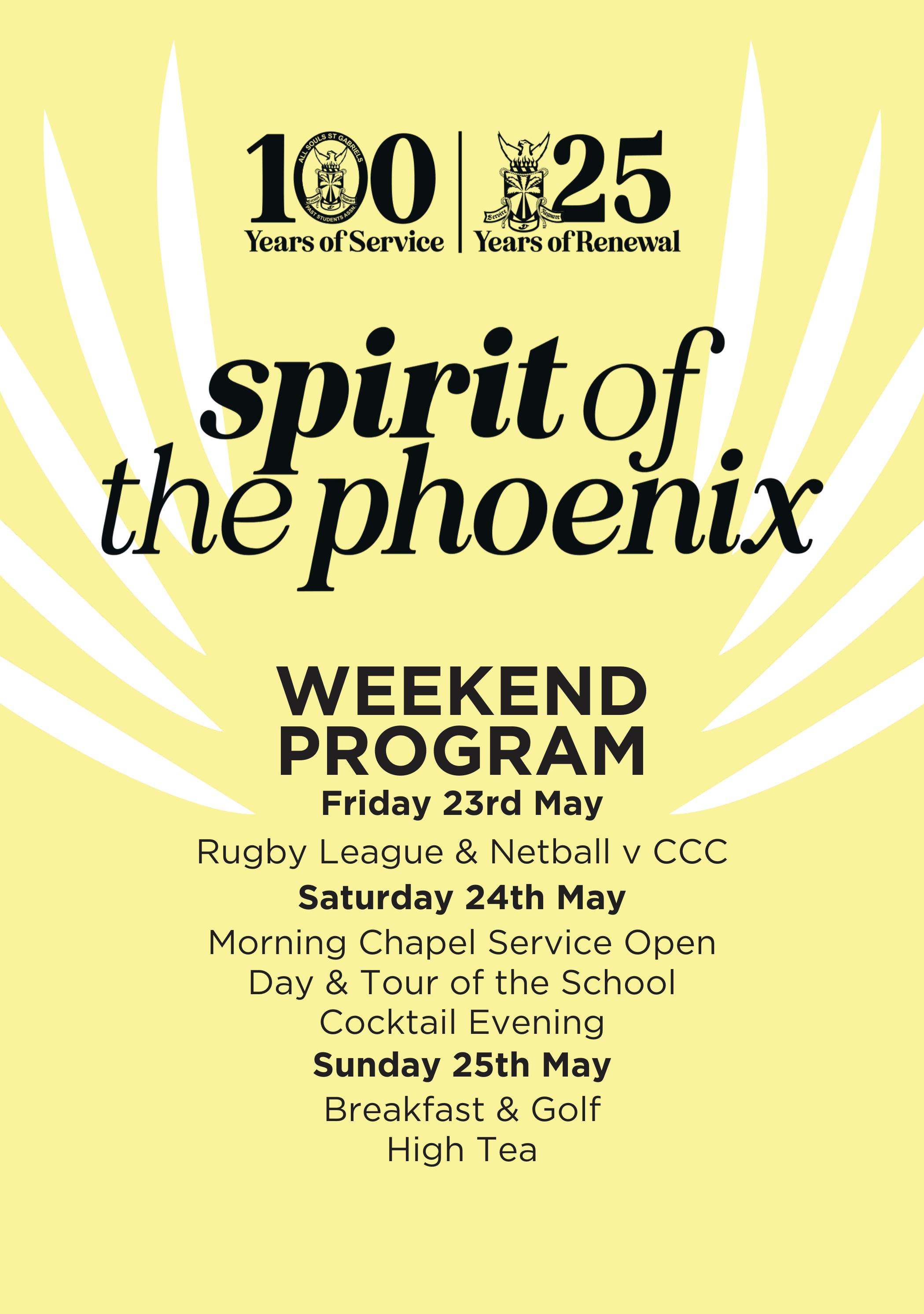 To mark these incredible milestones we are holding a weekend of celebrations aptly named the “Spirit of the Phoenix”. The weekend kicks off on Friday, 23 May with our much-loved rugby league and netball matches against Columba Catholic College, followed by a full day of celebration on Saturday including a Chapel Service, Open Day, and the highlight event — the Cocktail Evening. The festivities conclude on Sunday, 25 May with a relaxed Golf Morning or High Tea. This promises to be a truly special weekend for our community. More information, along with ticketing details, can be found on the ASSG website.