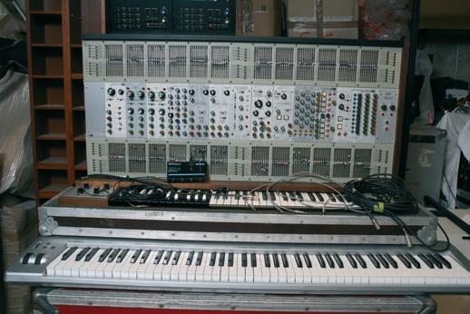 Elsewhere in the building is a larger performance/store room which can only be described as extremely rustic, with patched-up walls and a vaulted brick ceiling shored up by steel girders. Although some plasterboard has been thrown up here and there, the room is still very much the store area it no doubt was 150 years ago, and, as such, is packed to the vaults with flightcases, boxes and shelves containing miscellaneous gear gathered throughout Jean Michel’s career. Squeezed in the middle of all this, however, wired into a makeshift PA system and ready to play, is one of the most impressive vintage synthesizer collections anyone is likely to see. These are no museum pieces, however: they are fully functional, complete with custom modifications and surrounded by soldering irons and torches so that quick repairs can be undertaken.