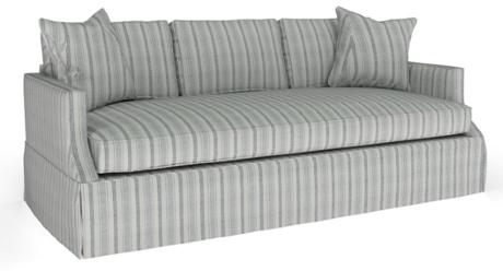 Box seat cushion and tight sloped back with knife-edge toss pillow. Narrow, sloped track arm. Waterfall skirt.