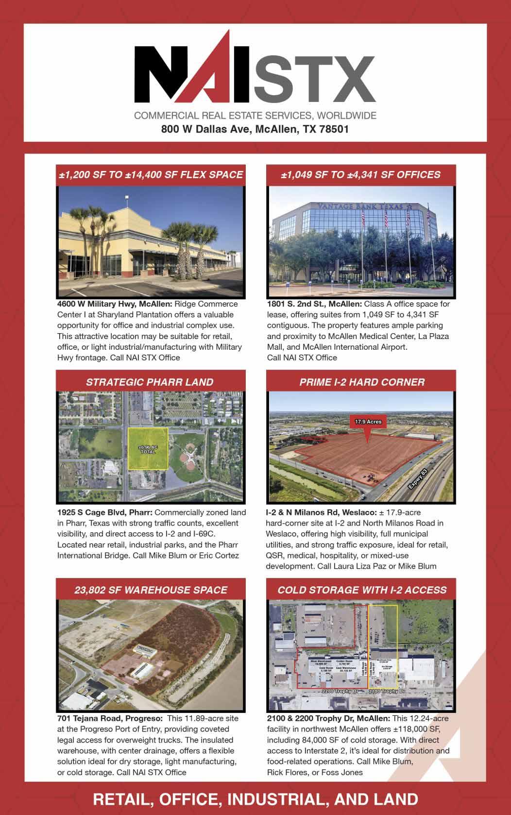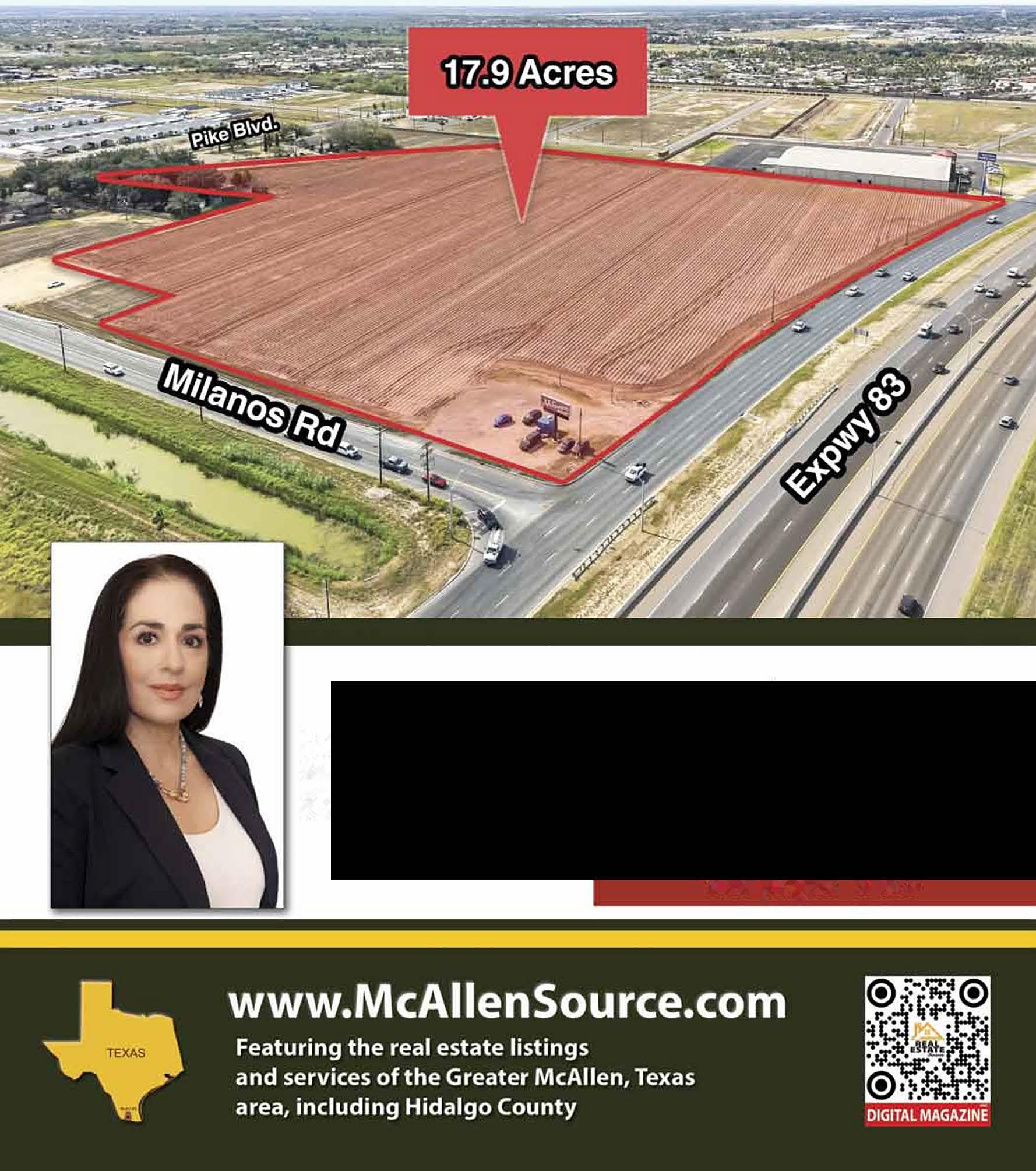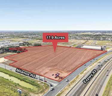 This ±17.9-acre development site sits at the hard corner of Interstate 2 and North Milanos Road in Weslaco, Texas. Offering exceptional visibility, extensive frontage, and direct access along one of the Rio Grande Valley’s primary commercial corridors. This property has high daily traffic exposure, existing monument signage, and strong branding opportunities. Its layout and access support a wide range of uses, including retail, quick-service restaurants, medical, hospitality, service, and mixed-use development, making it a rare, development-ready opportunity in a high-growth Mid-Valley trade area. Laura Liza Paz, SIOR Sr. Partner • Managing Broker 956-227-8000 Next deadline is February 24th!