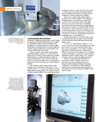 are based on where we want to be in ten years, not on a workforce that is fractionally trained and a platform that can rapidly deteriorate due to a change in market condition or a change in employment condition.” Smith says an example of this singular platform advantage is the control’s similarity across milling and turning operations. “All controls are customized to a certain extent,” Smith acknowledges. “But unlike Siemens, many other control series are individually customized so that the keyboard layout will be different from machine to machine. The Sinumerik 840D sl CNC is consistent. So when you train your operators, you can say, here’s the jog button, here’s the axes button, here’s your alarm button and your offset button. And this level of consistency extends to a graphical interface that really complements how we teach and learn.” Teaching and learning are closely held values within an organization that uses a breadth of visual techniques to foster education, efficient information sharing, and quality control. “We are a very visual company,” Smith says. “We use a lot of colors and we buy a lot of printer toner. Our parts inventory uses color-coded tags and the same is true across our production. We use yellows and blues and reds for consistent instruction. And the Siemens 840D sl control uses the same approach. You are guided visually for such things as axis direction, approach point, final depth and other variables inside a cycle. And this is true from control to control, for milling and turning.” Smith says visually guided information flow is characteristic of today’s complex range of nextgeneration electronic communications, because this speeds understanding and information sharing. Whether for a smart phone or a CNC, graphically guided interfaces enable rapid learning and proficiency, a fact that has been well leveraged by the 840D control interface design.