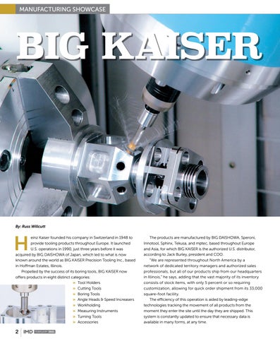 einz Kaiser founded his company in Switzerland in 1948 to provide tooling products throughout Europe. It launched U.S. operations in 1990, just three years before it was acquired by BIG DAISHOWA of Japan, which led to what is now known around the world as BIG KAISER Precision Tooling Inc., based in Hoffman Estates, Illinois. Propelled by the success of its boring tools, BIG KAISER now offers products in eight distinct categories: » Tool Holders » Cutting Tools » Boring Tools » Angle Heads & Speed Increasers » Workholding » Measuring Instruments » Turning Tools » Accessories