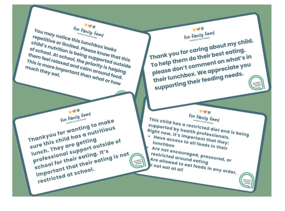While I have created official “Dr Rachel/Fun Family Food” lunchbox communication cards (which you can access at - fun-family-food.kit.com/products/ mlr-communication-cards), the principle can still be implemented without them. These are laminated cards that go inside your child’s lunchbox and communicate on your, or your health practitioner’s, behalf. The cards might say things like, “I have a disability that affects my eating, and I do well when I am allowed to choose what and how much I eat,” or “Please refer to my personalised support plan to learn how to support my eating needs at school.” They take the responsibility off your child, educate staff about your child’s needs, and help maintain Responsive Feeding at school.