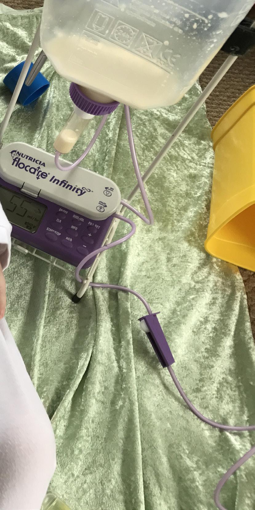 end of the syringe, one ml at a time. Once my daughter’s body learned to tolerate the feeds, we used a feeding pump, which could be set to deliver her formula at a certain rate and over a certain time. It was a learning curve, but we had excellent and experienced nurses in hospital who answered my millions of questions. And I joined several tube feeding support groups online, to ask for advice and learn from other parents. They became my best source of info and help, especially at 3am when the feeding pump was beeping annoyingly and I didn’t know how to stop it!