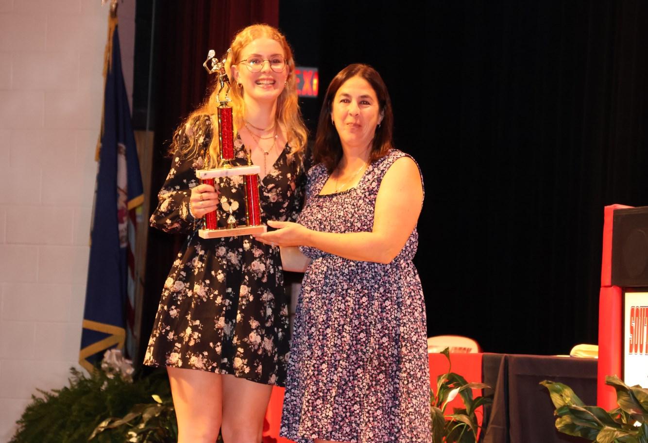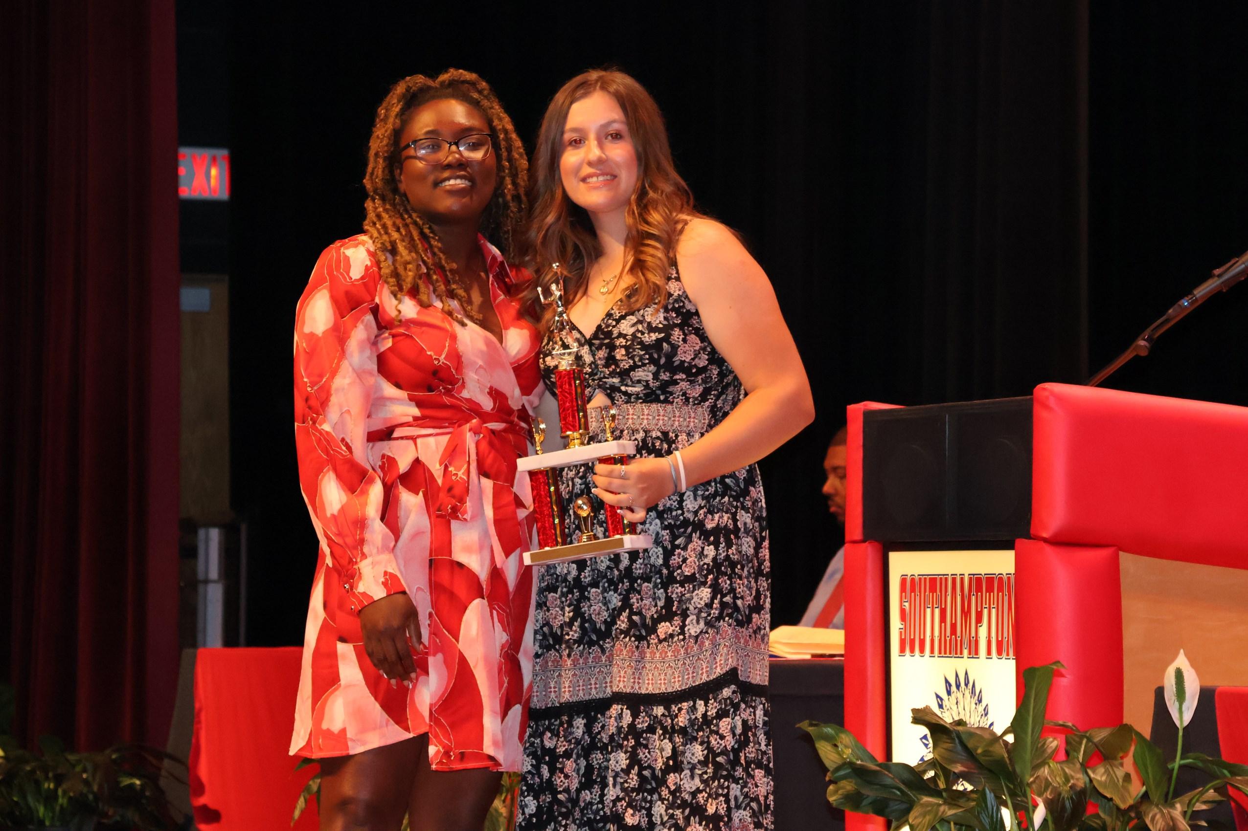 Southampton High School’s tennis coach and Spanish teacher, Julie Belter, handed Lily Zimmer her trophy before both posed for the camera. Zimmer had just won the district-wide tennis championship game. She wore gold and cream at the award ceremony, and her accessories flashed as brightly as her smile when she walked across the stage. Zimmer’s permanent smile showed how proud she was of herself.