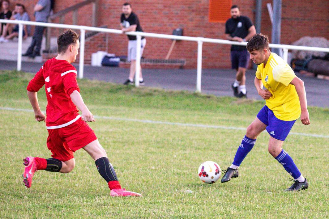 Vice-Captain Ryan Harris clears the ball from the back-line (main picture). Midfielder Ellis Champkins takes on a defender in the attacking third (below).Want to make your next event something to remember? Let the Spitting Pig Company cater for your every need!