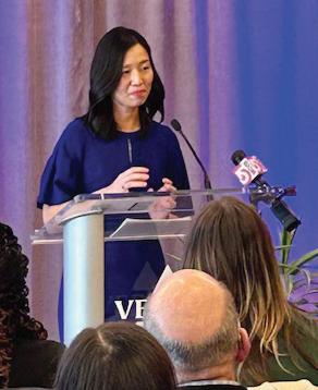 ($4,700,000) in City of Boston funds, which will be used to educate and employ Boston residents in careers devoted to the life sciences. The meeting took place in Vertex Pharmaceuticals’ conference room at their corporate headquarters – 50 Northern Avenue in South Boston’s Seaport District. It was very well attended; more than 100 educators, executives, and members of the press were present. Dr. Reshma Kewalramani, M.D., the CEO and President of Vertex Pharmaceuticals, opened the meeting by stating how excited Vertex is about “the hotbed of talent we have in Boston”. She then enthusiastically introduced Mayor Wu.