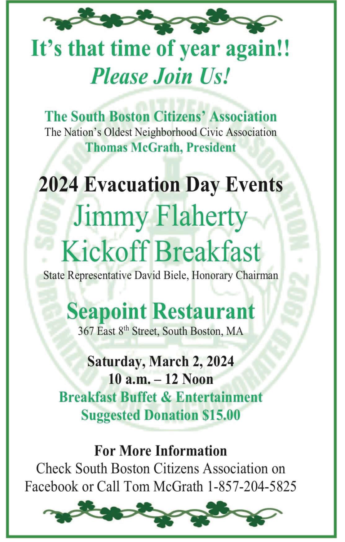 The event Chairman, once again will be South Boston’s own State representative David Biele, who continues to lead the fight to preserve the historical importance of Evacuation Day while serving in the Massachusetts House of Representatives. “As president of the Association, it is an honor for me to work with Dave to kick-off the festivities. Dave’s commitment