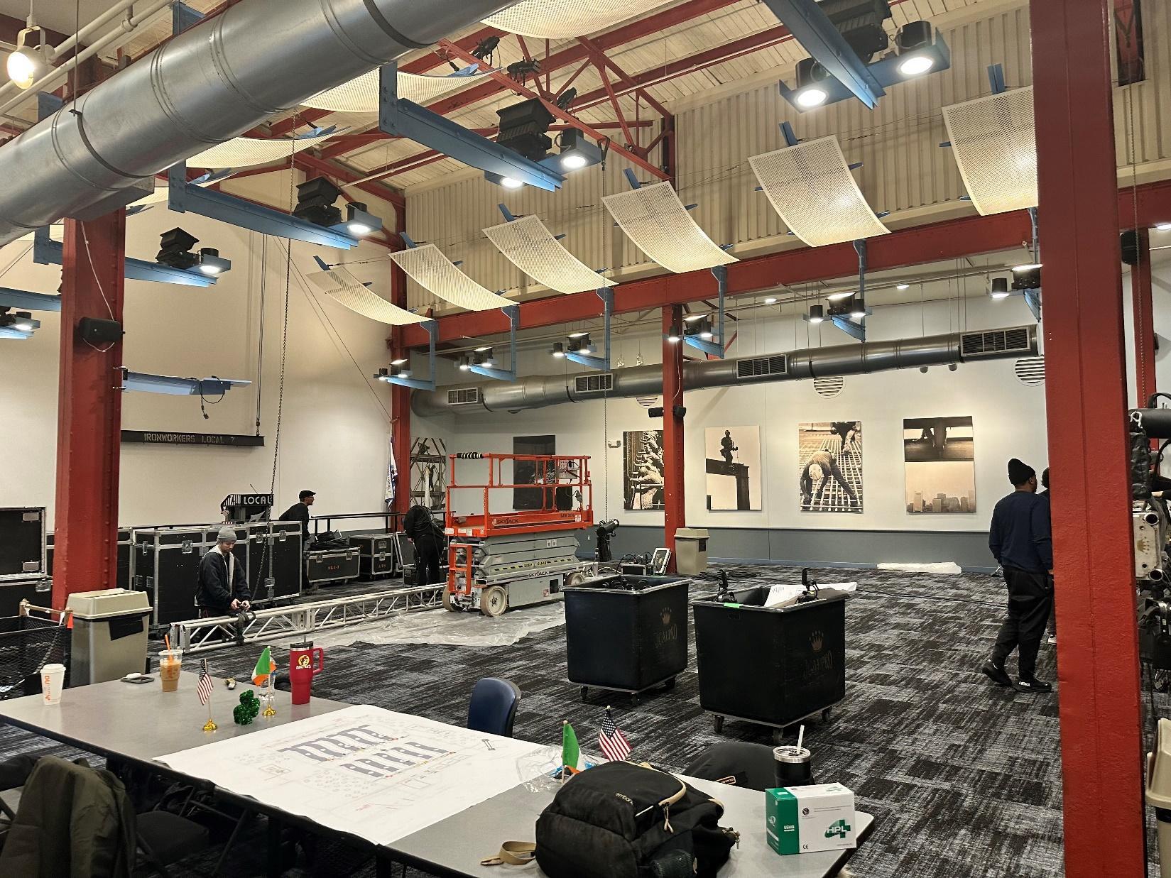 Union members begin preparing the Ironworkers Union Hall well before the first guest arrives. Crews assemble the event space, coordinate logistics, and prepare the hall to host a full morning of programming. Broadcast teams rig lighting, sound, and stage equipment to ensure the event can be carried live on television, radio, and online.