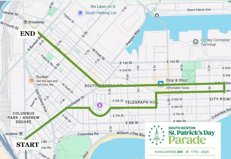 The annual St. Patrick’s Day parade will be held on Sunday, March 15, 2026 along the “historical” route but traveling in the reverse direction, using East Sixth Street instead of East Fifth Street. The route will be Dorchester Street to Telegraph Street to Thomas Park (southerly arm), to G Street, to East Sixth Street, to K Street to East Fourth Street to P Street to East Broadway to West Broadway. The streets listed here will be closed to through-traffic for the duration of the event.