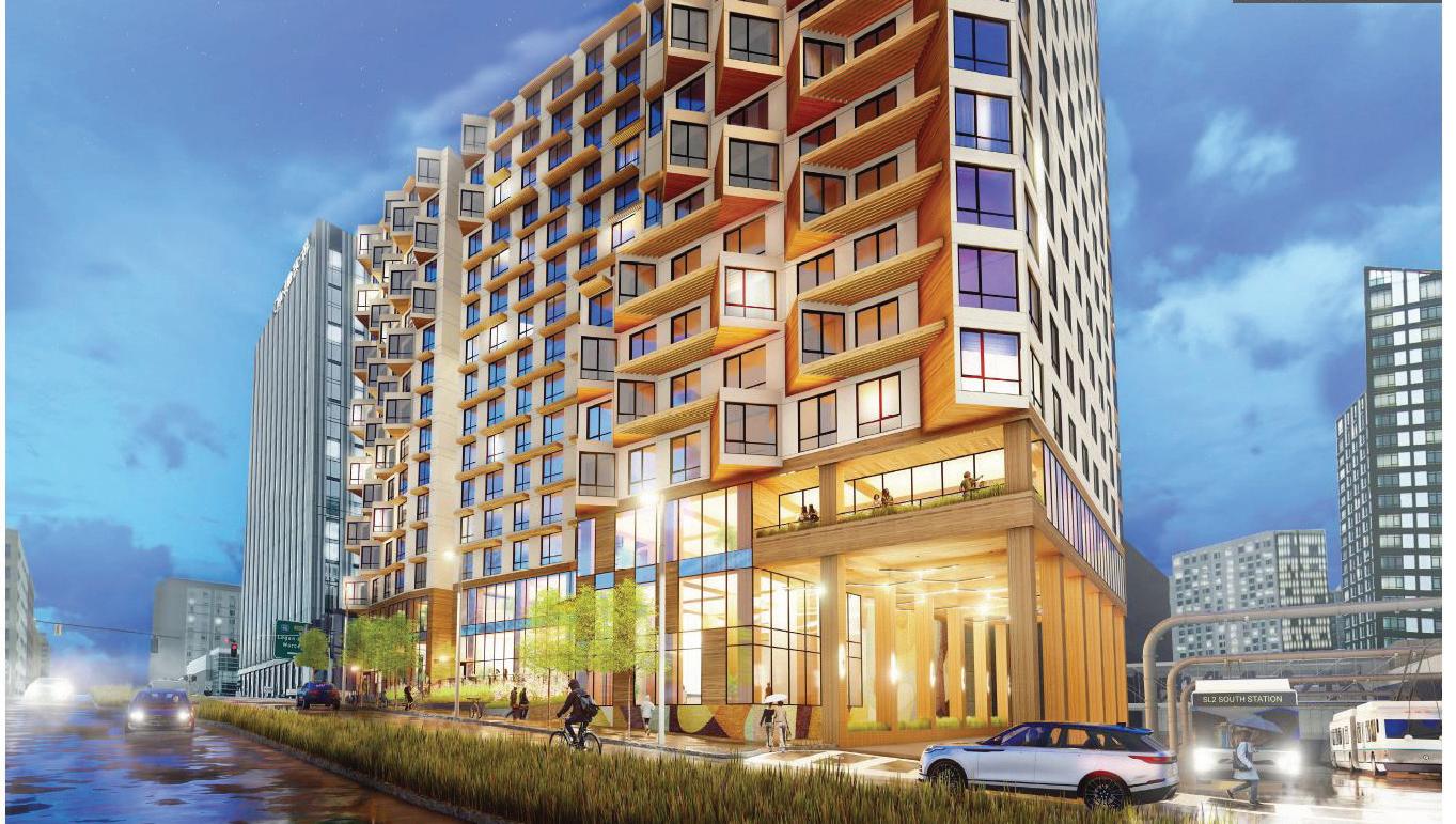 a 15-story building totaling 224,000 square feet. D Street will be activated with 15,000 square feet of community retail space and a childcare facility. The project is conveniently located near two MBTA Silver Line stations. The building will be all-electric, including the use of solar shading devices and solar photovoltaic panels on the roof. The overall design will be highly sustainable and pursue Passive House and LEED Gold design standards.