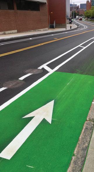 The redesigning of local roads to allow more lanes for nonautomotive uses proceeds. The photograph shows the recent layout of traffic lanes along A Street, near where Second and Third Streets intersect it. The lanes are expressly set up to allow bicycles and pedestrians to proceed safely, and they are similar to the pilot lane program being installed on Summer Street between First Street here and the intersection at South Station and Atlantic Avenue