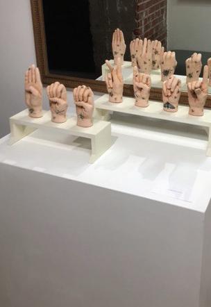“BEE KIND”, sign language in stained red clay by Hebe Garcia