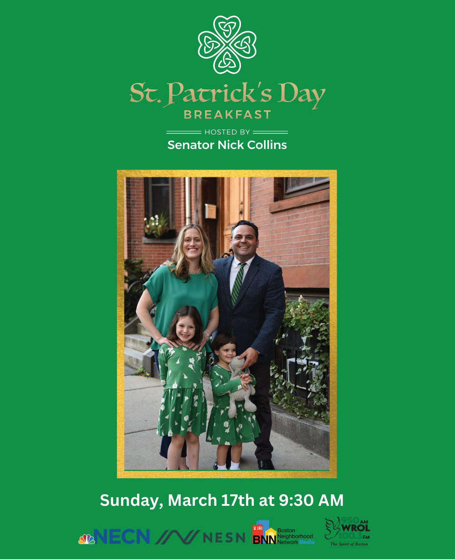 he annual St. Patrick’s Day Breakfast hosted by Sen. Nick Collins will take place at the Ironworkers Local 7 Union Hall in South Boston on the morning of Sunday, March 17th. Featured guests include U.S. Senator Elizabeth Warren, Governor Maura Healey, Congressman Stephen Lynch, Congresswoman Ayanna Pressley, Senate President Karen Spilka, Auditor Diana Dizoglio and Boston Mayor Michelle Wu. They will be joined at the dais by Suffolk County District Attorney