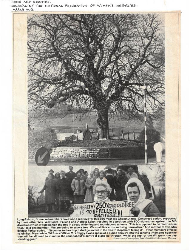 The proposal put forward by the Somerset County Council was for road development of an M5 diversion, which would banish the tree in a road widening and roundabout scheme. This was strongly opposed by the Parish Council and the cause taken up by the women of the Women’s Institute.
