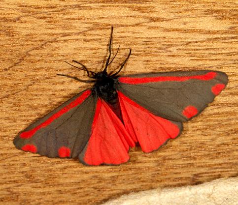 The black and red Cinnabar is conspicuous for good reasons. Birds recognise it easily and learn that it tastes horrid. Cinnabar caterpillars feed on ragwort which tastes nasty and is usually avoided by other creatures. Yellow and black Cinnabar caterpillars are a very conspicuous warning sign, too.