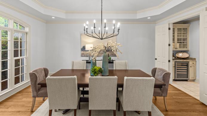 The formal dining room has a butler’s pantry nearby. There is a first-floor office with beautiful bookcases to embrace your books and