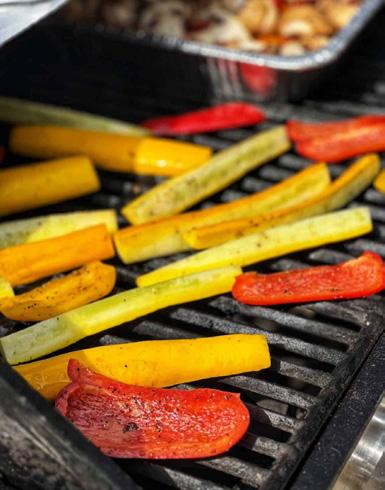 In addition to zucchini, yellow squash and bell peppers, you may choose other vegetables that work well for grilling including eggplant, asparagus, butternut squash, acorn squash, poblano peppers or