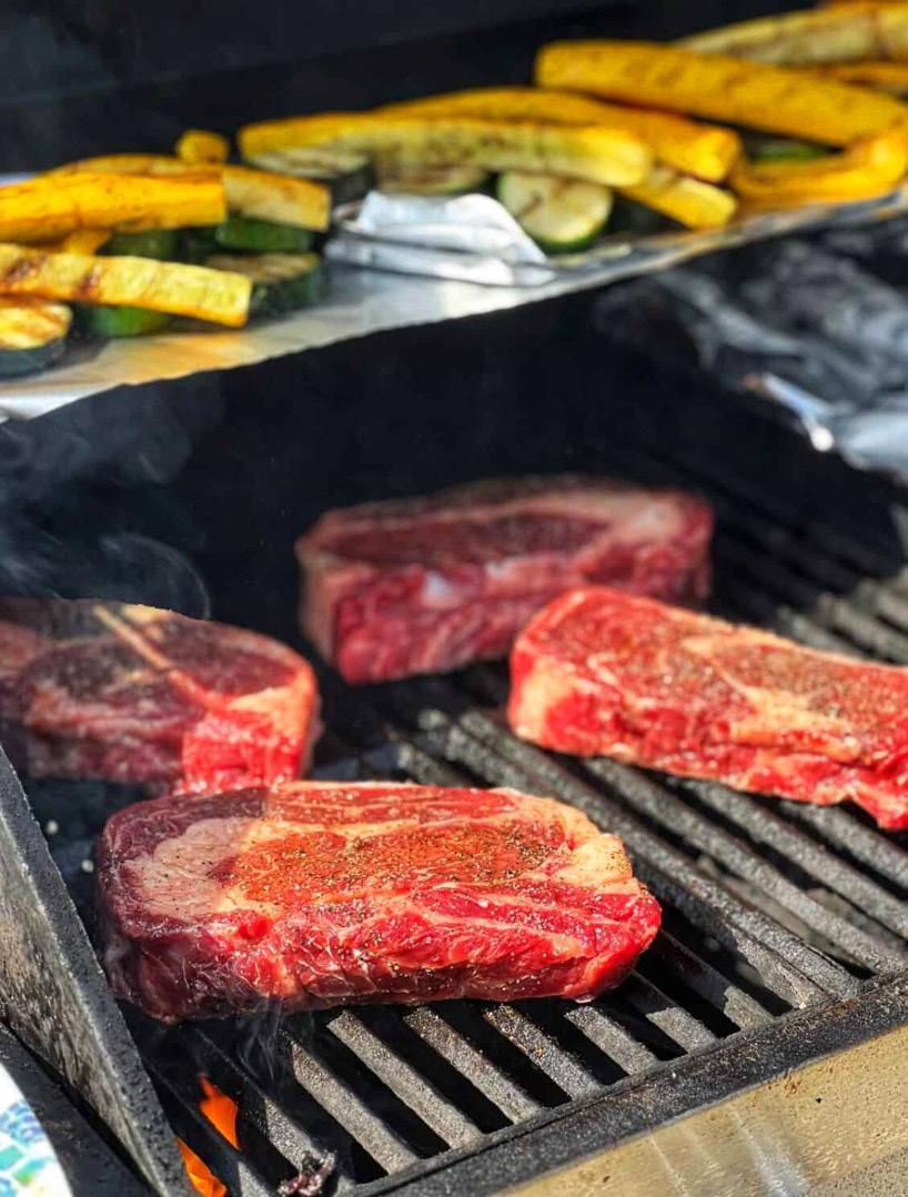 Heat the grill to medium-high. Grill the vegetables first, until they are slightly tender with a bit of crunch. Reserve the vegetables on the rack of the grill while the steaks are grilling.