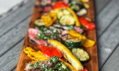 Scatter the grilled vegetables around and on top of the protein on the board.