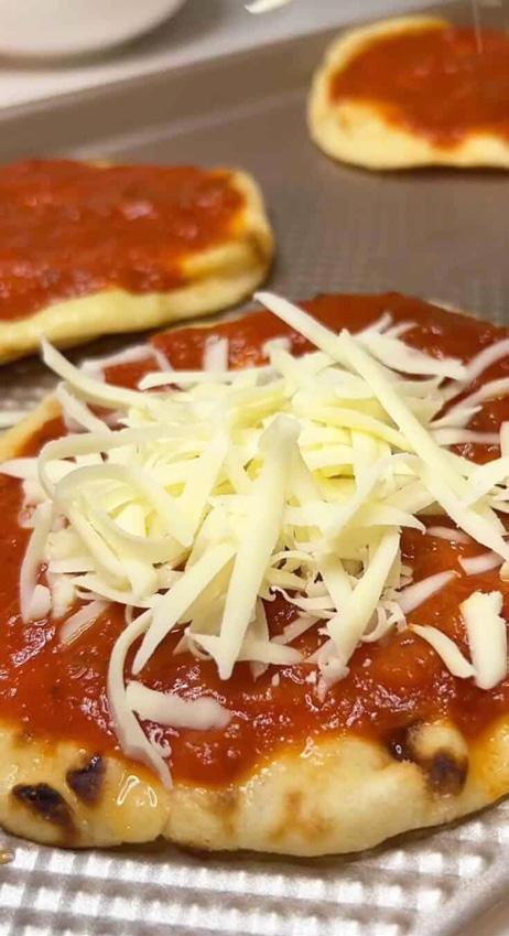 • Spoon marinara sauce onto each naan, spreading it evenly to cover the surface.