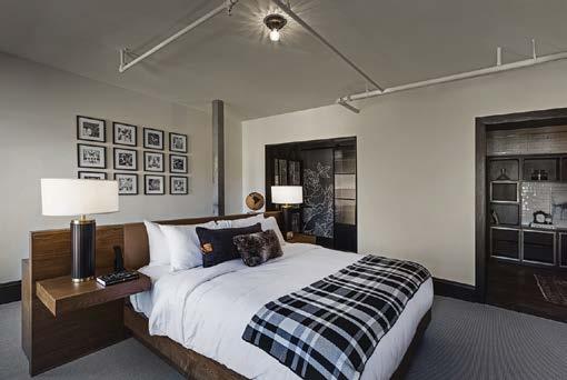 Accommodations here are styl ish with a Midwestern point of view - spacious and welcoming spaces characterized by hints of the structure’s historic roots (think hardwood, exposed brick, original industrial details). En compassing two buildings origi nally built by Pabst Blue Ribbon and used as a bottling and distri bution center, Crossroads Hotel’s design pays homage to the city’s