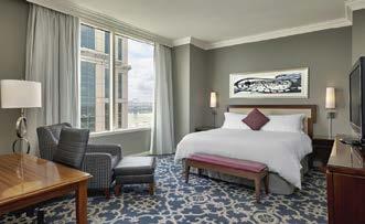 As lovely as the views are in each accommodation, the vistas to behold beyond the wall-to-wall windows of this 22-story Big Easy high-rise are even more mesmerizing – nearby New Orleans neighborhoods ablaze in color, the city skyline sparkling at night and the magnificent Mississippi River, always a storied beauty to behold. Each of the generously sized rooms are finished in modern blues, grays and pops of bright color and characterized by thoughtful décor and Southern charm.