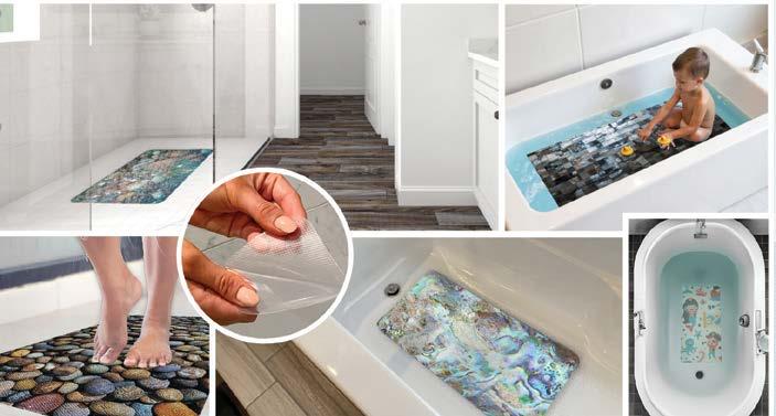 “Our engineered non-abrasive patent process and ability to do custom sizes, graphics and logos is really what sets us apart from your standard bathmat or abrasive safety treads,” says Harris. “Our safety traction is non-abrasive and so versatile, you can use it in your bathtub, on your boat or on the wake surfboard that boat is towing behind it.”