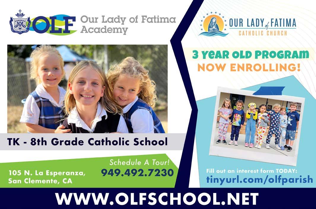 Our Lady of Fatima Academy is located at 105 N. La Esperanza in San Clemente. (949) 492-7320. www.olfschool.net