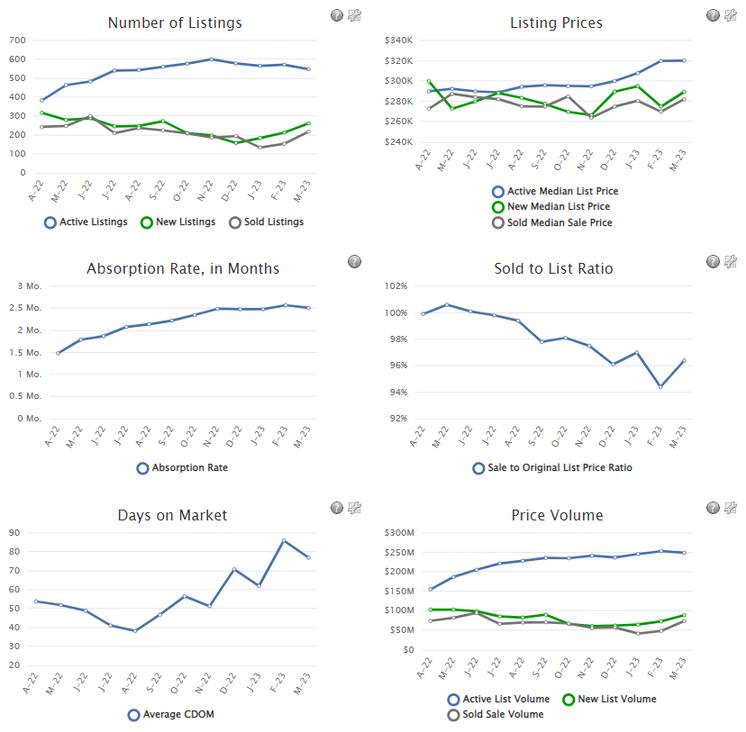 Statistic 23-Mar 22-Mar % Chg 2023 YTD 2022 YTD % Chg Absorption Rate 2.5 1.6 61.9 2.5 1.6 60.5 Average List Price $454,964 $396,492 14.8 $385,305 $346,400 11.2 Median List Price $320,140 $289,930 10.4 $295,000 $277,359 6.4 Average Sale Price $339,616 $311,789 8.9 $325,980 $317,111 2.8 Median Sale Price $282,200 $269,900 4.6 $276,453 $269,600 2.5 Average CDOM 76 68 11.8 75 63 19.1 Median CDOM 44 29 51.7 48 32 50.0