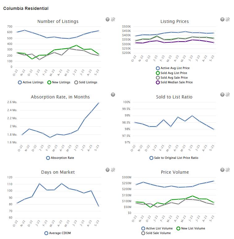 Statistic 23-Sep 22-Sep % Chg 2023 YTD 2022 YTD % Chg Absorption Rate 2.6 1.8 46.6 2.0 1.3 52.3 Average List Price $427,723 $396,880 7.8 $387,648 $360,449 7.6 Median List Price $372,950 $374,900 -0.5 $349,900 $329,900 6.1 Average Sale Price $366,241 $355,187 3.1 $368,787 $349,000 5.7 Median Sale Price $320,000 $330,000 -3.0 $334,500 $320,000 4.5 Average CDOM 77.0 76.0 1.3 100.0 75.0 33.3 Median CDOM 56.0 54.0 3.7 62.0 47.0 31.9