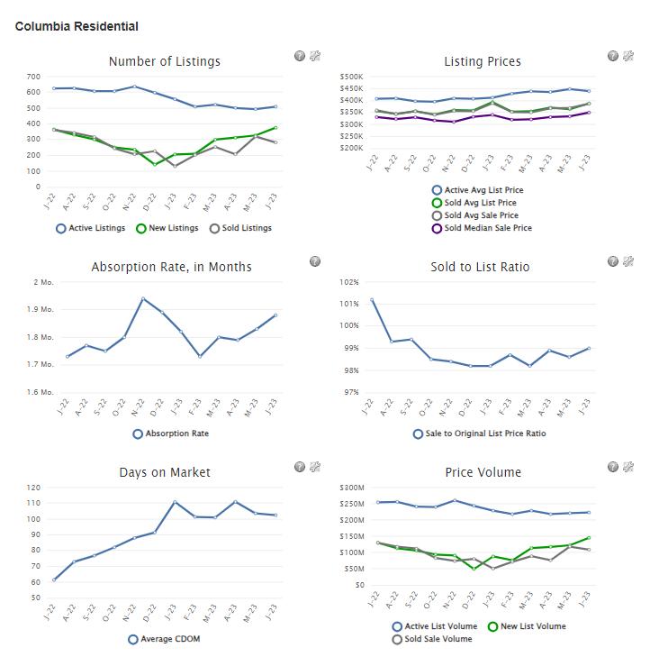 Statistic 23-Jun 22-Jun % Chg 2023 YTD 2022 YTD % Chg Absorption Rate 1.9 1.4 30.6 1.8 1.1 64.6 Average List Price $438,875 $401,196 9.4 $388,615 $364,271 6.7 Median List Price $379,900 $363,500 4.5 $349,900 $330,740 5.8 Average Sale Price $386,727 $365,870 5.7 $368,390 $347,006 6.2 Median Sale Price $350,000 $330,000 6.1 $333,900 $317,000 5.3 Average CDOM 102.0 72.0 41.7 104.0 77.0 35.1 Median CDOM 60.0 45.0 33.3 63.0 46.0 37.0