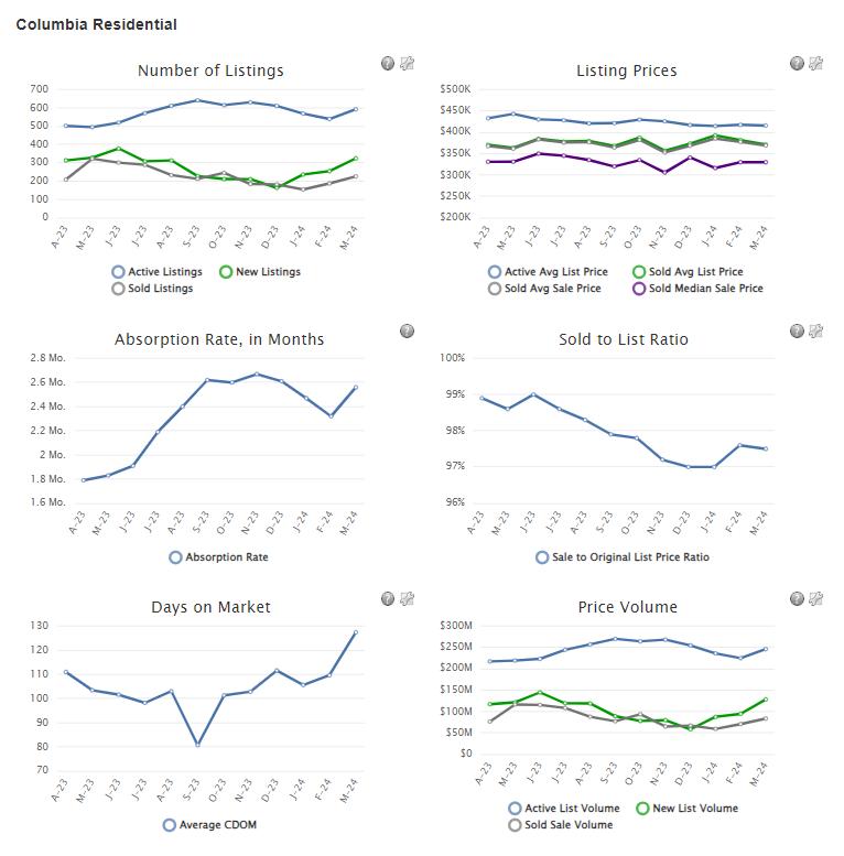 Statistic 24-Mar 23-Mar % Chg 2024 YTD 2023 YTD % Chg Absorption Rate 2.6 1.8 41.4 2.5 1.8 36.9 Average List Price $415,726 $435,853 -4.6 $396,639 $394,584 0.5 Median List Price $362,000 $392,500 -7.8 $349,000 $359,000 -2.8 Average Sale Price $369,127 $351,096 5.1 $376,248 $359,939 4.5 Median Sale Price $329,900 $322,500 2.3 $325,000 $325,000 0.0 Average CDOM 127.0 101.0 25.7 115.0 103.0 11.7 Median CDOM 93.0 58.0 60.3 85.0 74.0 14.9