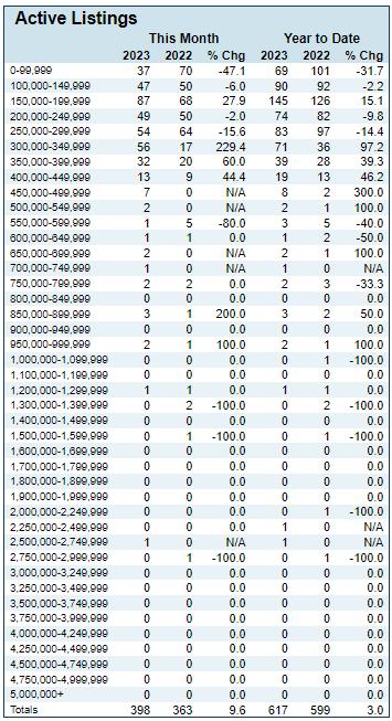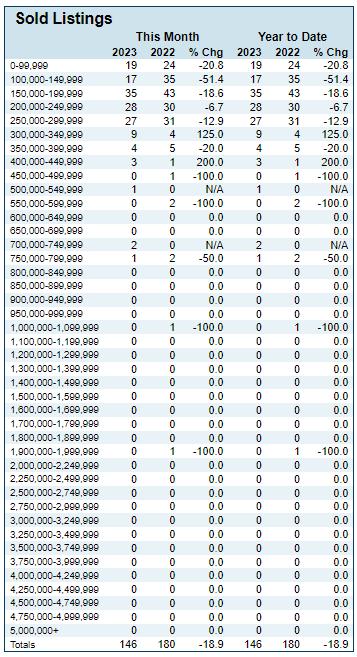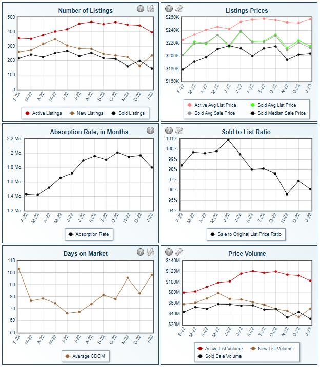 Statistic 23-Jan 22-Jan % Chg 2023 YTD 2022 YTD % Chg Absorption Rate 1.8 1.46 23.3 1.8 1.46 23.3 Average List Price $257,109 $231,822 10.9 $239,340 $227,387 5.3 Median List Price $225,500 $192,000 17.5 $200,000 $189,900 5.3 Average Sale Price $212,537 $211,512 0.5 $212,537 $211,512 0.5 Median Sale Price $203,700 $185,450 9.8 $203,700 $185,450 9.8 Average CDOM 98.0 86.0 14.0 98.0 85.0 15.3 Median CDOM 68.0 58.0 17.2 71.0 59.0 20.3