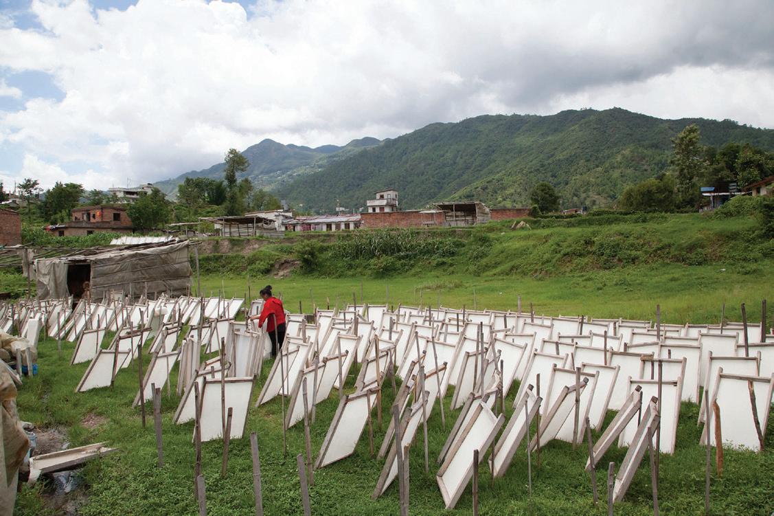 A Nepali paper factory on the skirts of the Kathmandu Valley where paper is left out to sundry each day. The paper is handmade made each day by women, from the growing of the plants to the construction of the paper, all they way through the selling in shops in Thamel, the tourist district of Kathmandu.