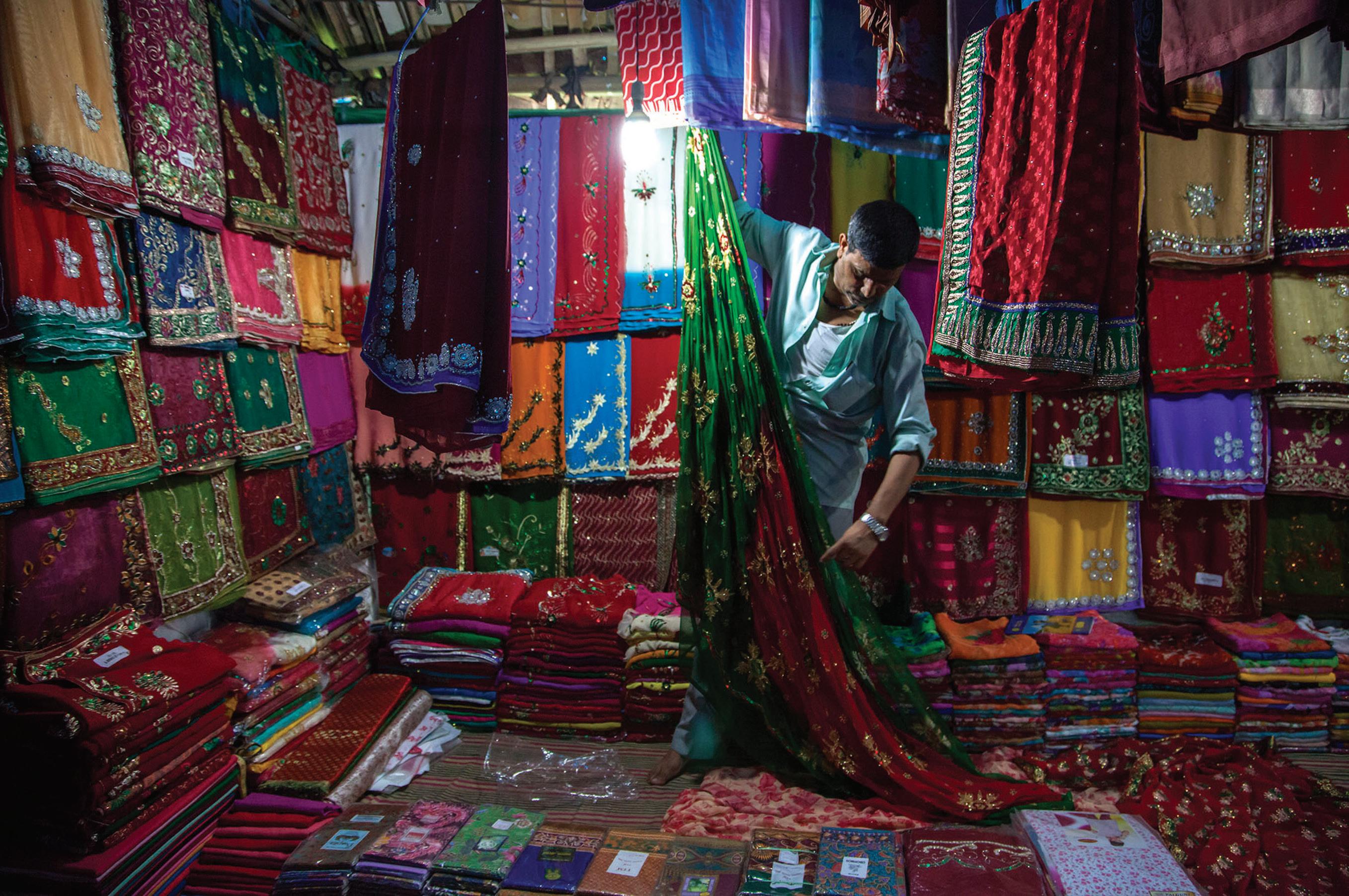 Sari shop owner folds up merchandise in his small stand in the Covered Market of Kathmandu, Nepal. ABOVE