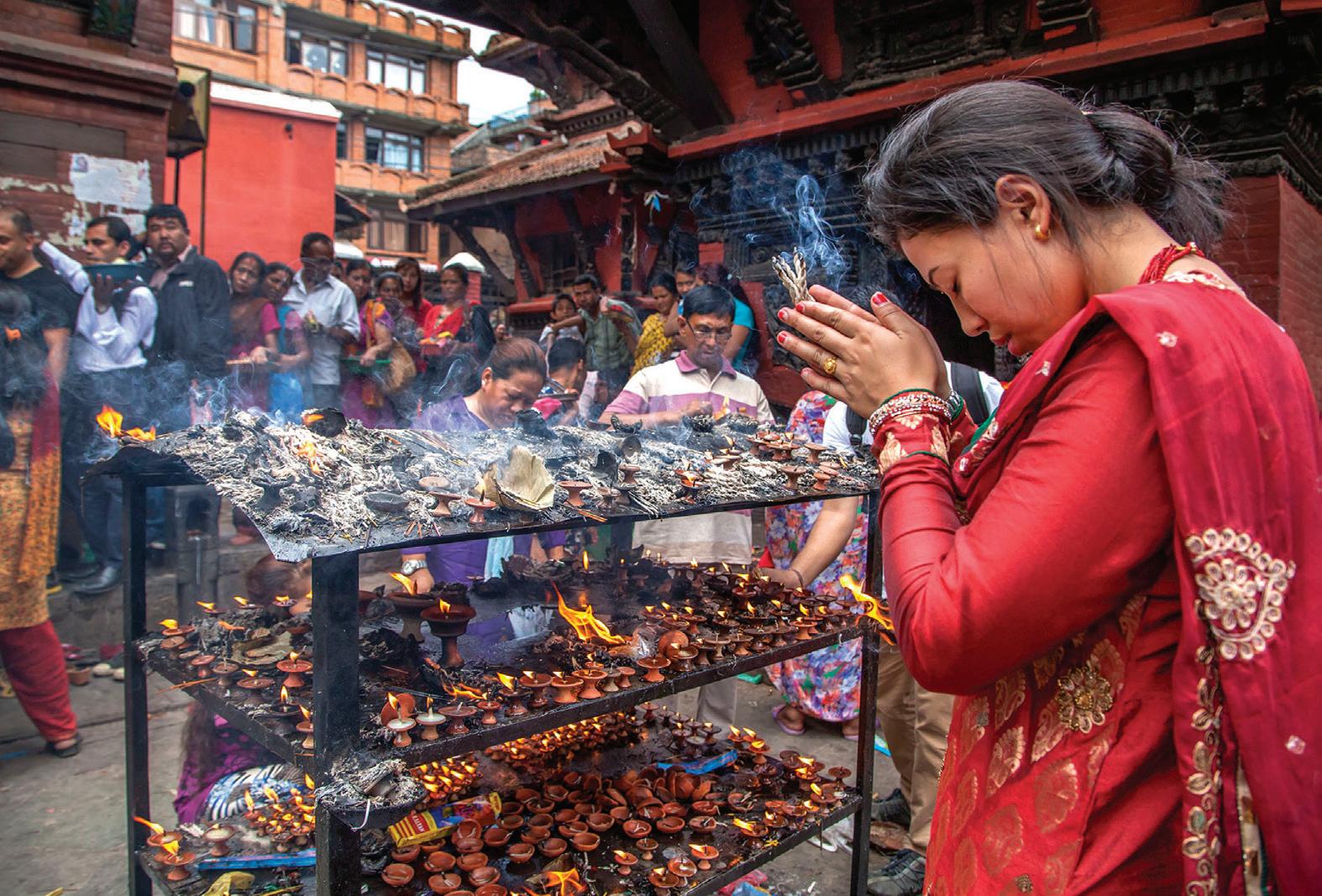 A woman prays with incense in her hands to Hindu gods at Kumbheshwor in the Lalitpur District.