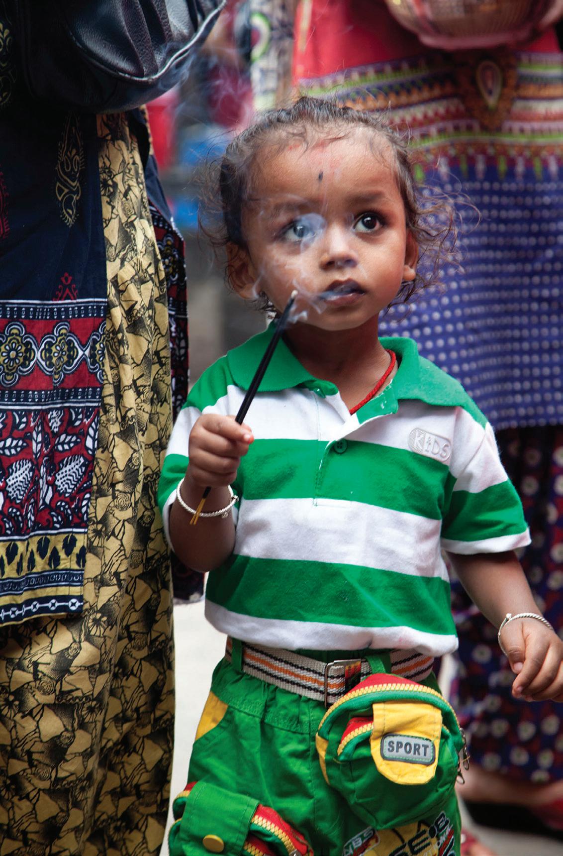 A young boy holds up incense towards a temple of a Hindu god on the first day of the Nepali calendar month that celebrates Lord Shiva. RIGHT