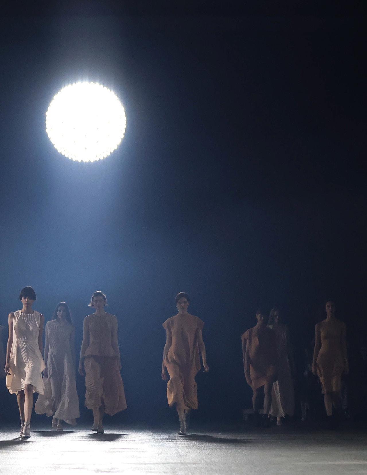 shoulder pads, bohemian-chic flowing gowns, and new takes on the traditional “little black dress.” The collection is also simplistic in its color scheme, only showing black, white, and silver garments.