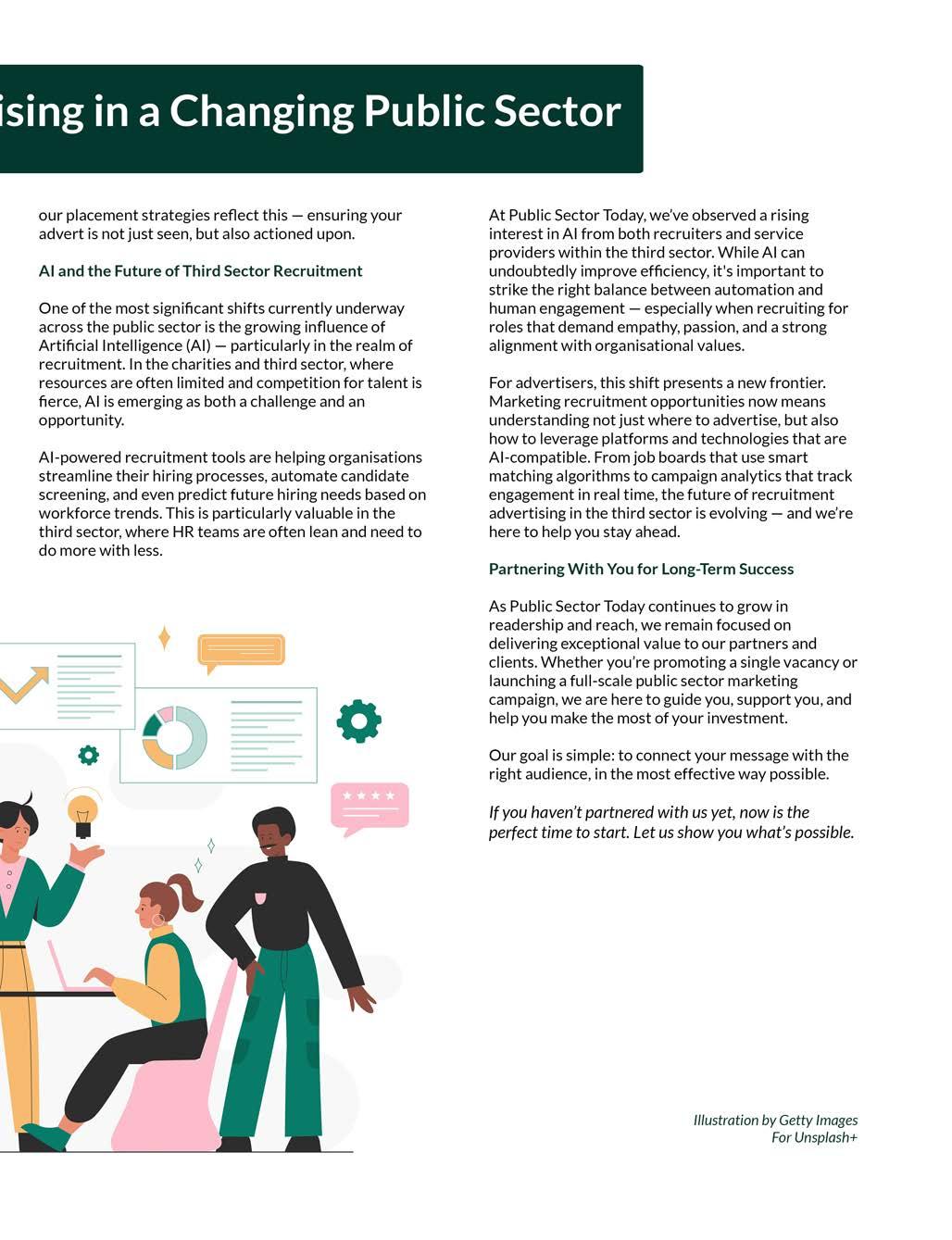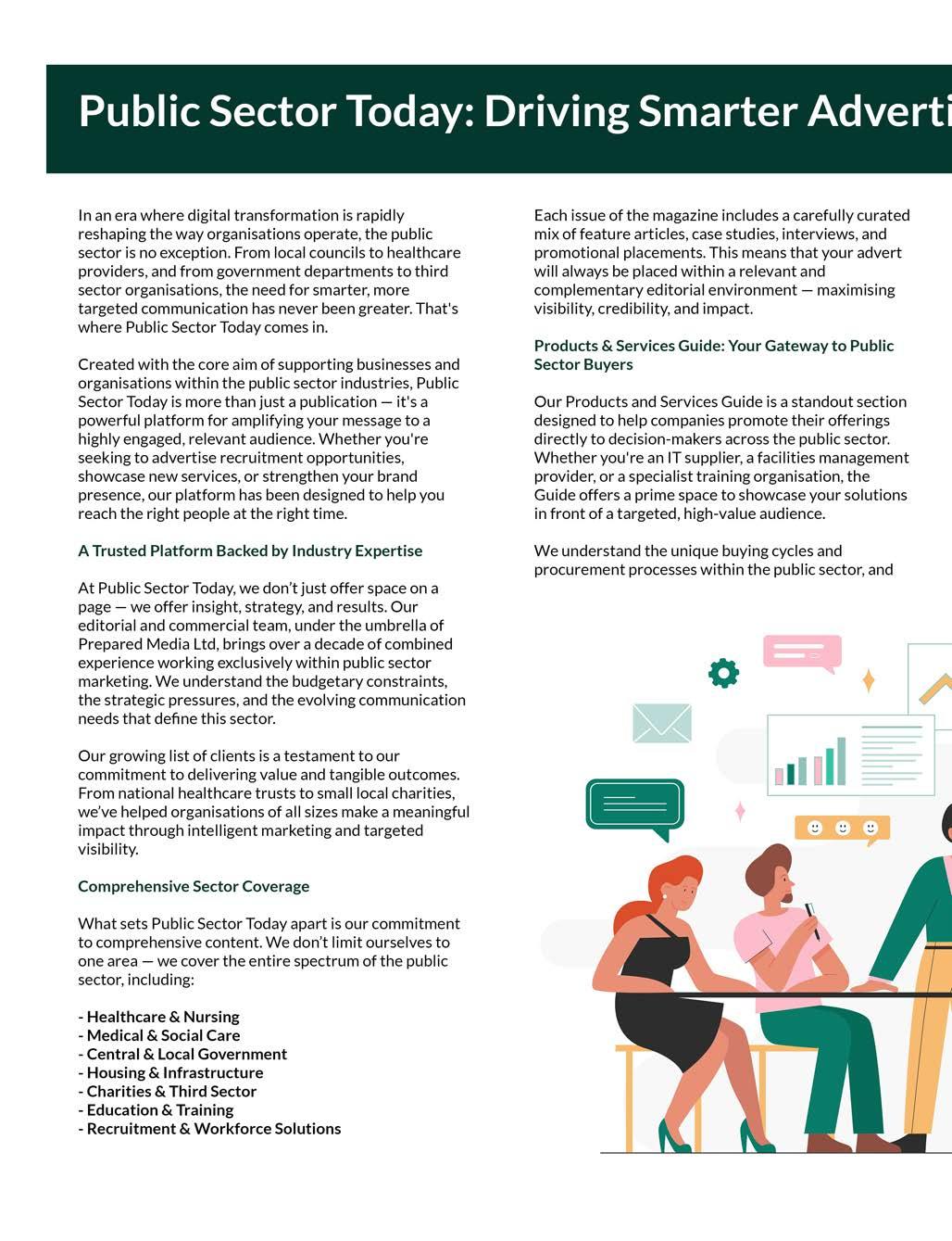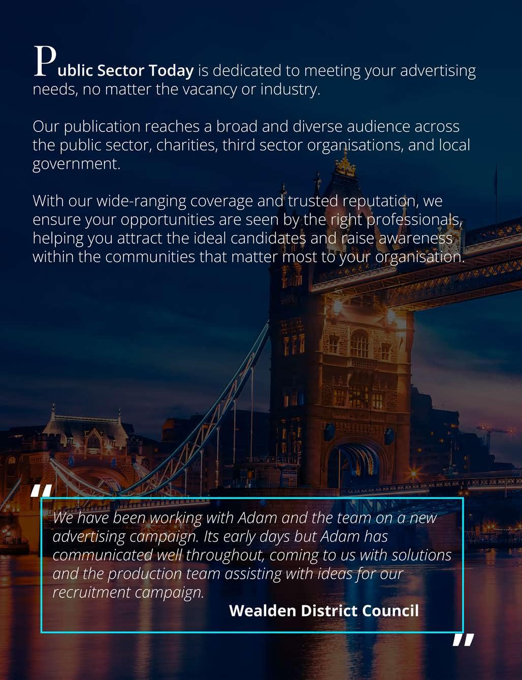 Public Sector Today is the publication created to further help businesses and companies within the Public Sector with their advertising and marketing needs. PST has an extensive client list throughout and our wide range of contents ensure that your advert will feature within the best space to maximize your results.