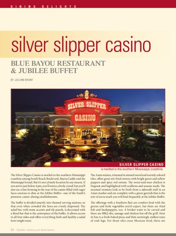 S I LV E R S L I P P E R C A S I N O is nestled in the southern Mississippi coastline. The Silver Slipper Casino is nestled in the southern Mississippi coastline among South Beach Boulevard, Bayou Caddy and the Mississippi Sound. But it’s not a lonely location by any means. If you arrive just before 4 pm, you’ll notice a lively crowd, but you’ll also see a line forming in the rear of the casino filled with eager faces anxious to dine at the Jubilee Buffet—one of the South’s premiere casino-dining establishments.