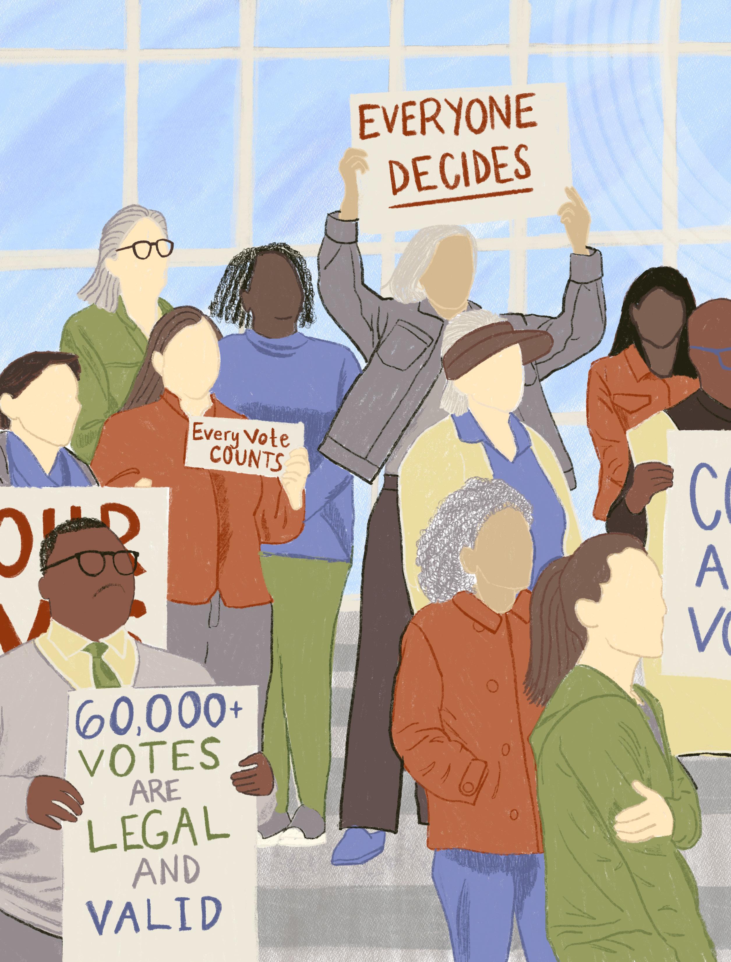 (Top) Protestors gather outside the Wake County Courthouse to voice their concern over Jefferson Griffin's inaccurate voter challenges.
