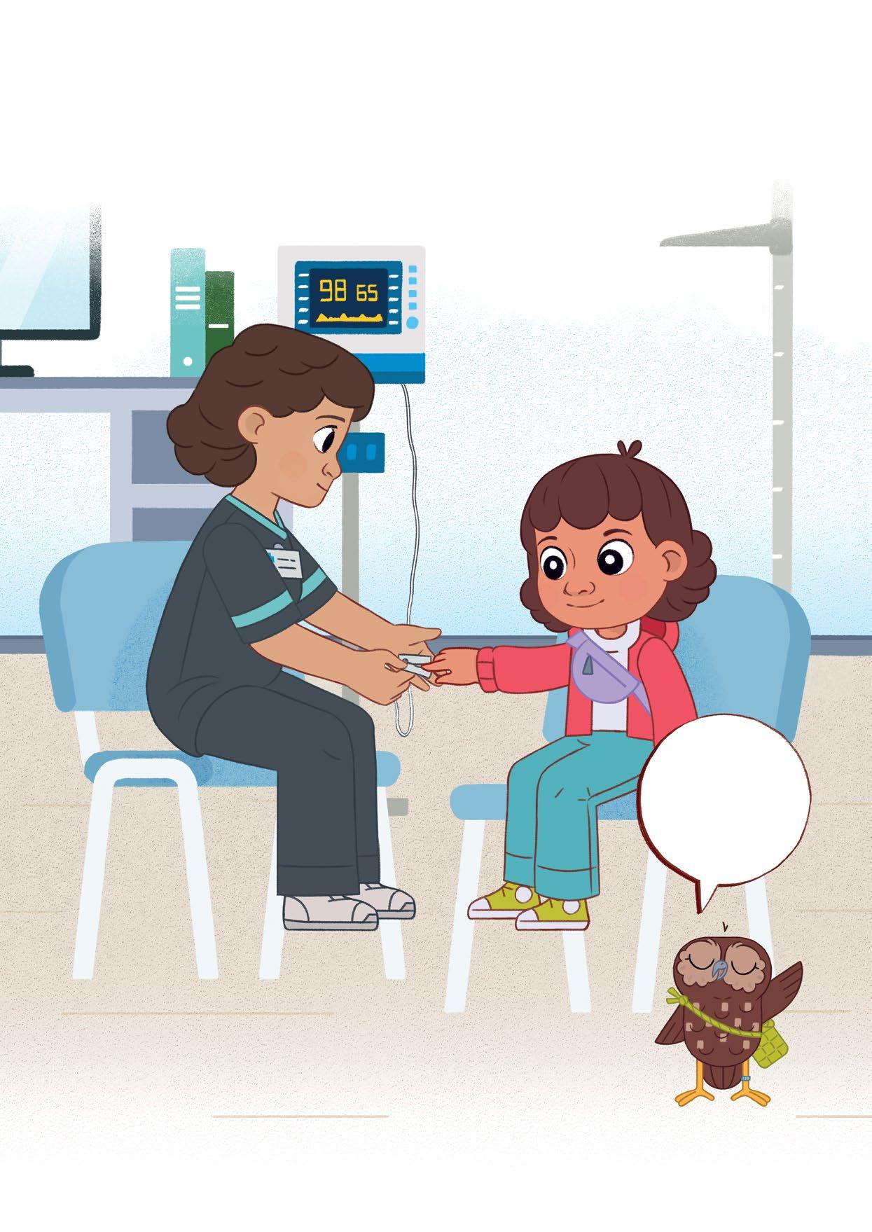 The nurse then checked their temperature with a special tool… and squeezed their arm with a funny cuff, as it pumped up. And then put a peg on their fingers!