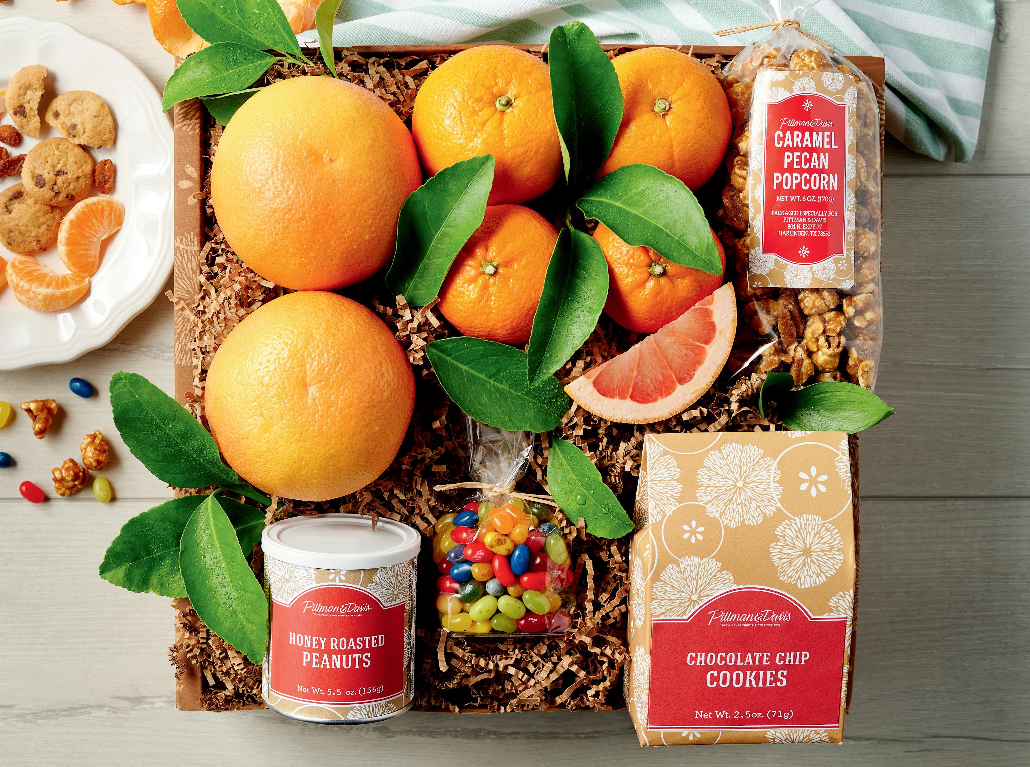eGot the munchies? Perfect for sharing, this gift box contains two each of our most beloved citrus varieties Rio Ruby™ Red Grapefruit, Navels, and Tangerines along with an assortment of snackable gourmet sweets including Honey-Roast Peanuts, Chocolate Chip Cookies, Caramel & Pecan Popcorn and Fruit Bowl Jelly Belly® Beans. (Available through mid-May.)