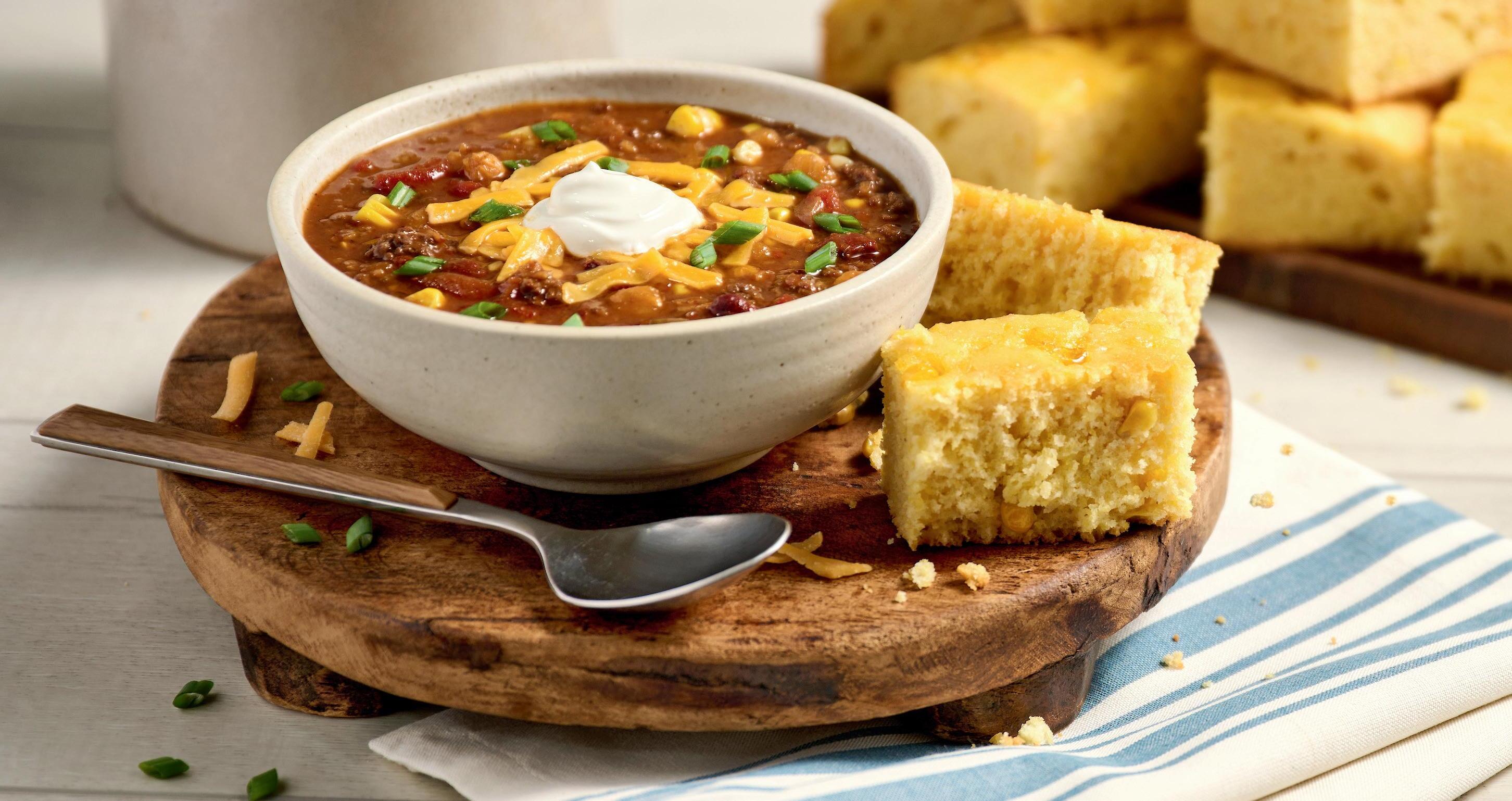 eWarm up a chilly day in a hurry with a bowl of spicy chili paired with moist, flavorful cornbread! Add just a few ingredients to this easy-to-follow kit and get chili night started in no time. Perfect for game days, parties, cookouts or a thoughtful gift.