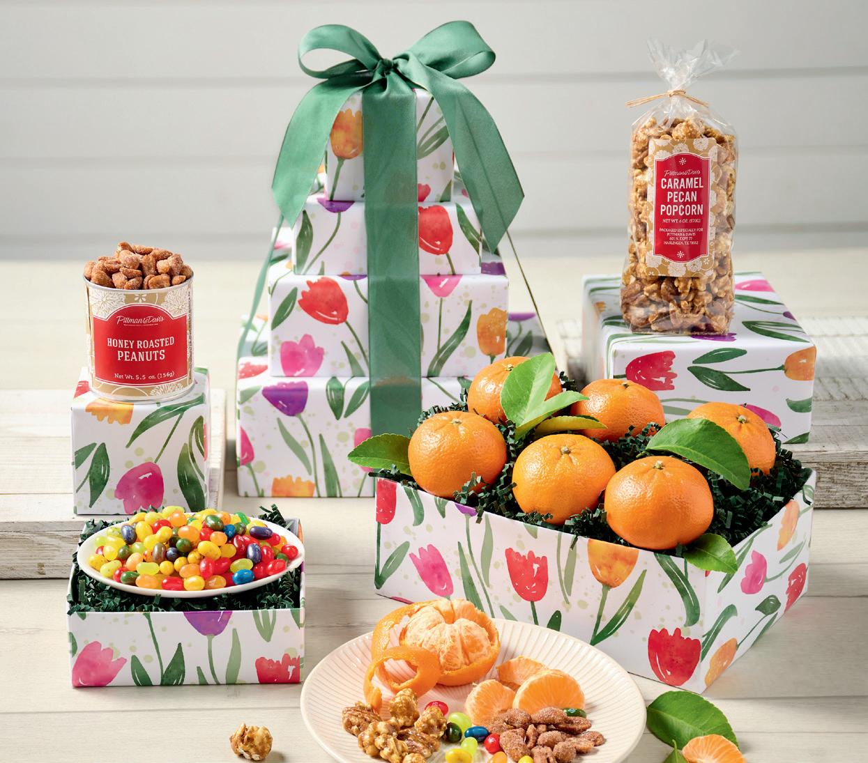 eA tower of treats packed in our exclusive tulip-decorated boxes is an ideal gift for Easter, Mother’s Day, or any spring event. Each box is brimming with goodies: six seedless Clementines are joined by Caramel & Pecan Popcorn, Fruit Bowl Jelly Belly® Beans and Honey-Roast Peanuts. Tied with a green ribbon. (Available through May.)